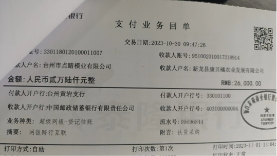 2023年10月30日,公司又向新龍縣康貝橘農(nóng)業(yè)發(fā)展有限公司扶貧采購(gòu)人民幣26000元整,幫助當(dāng)?shù)亻俎r(nóng)發(fā)展。